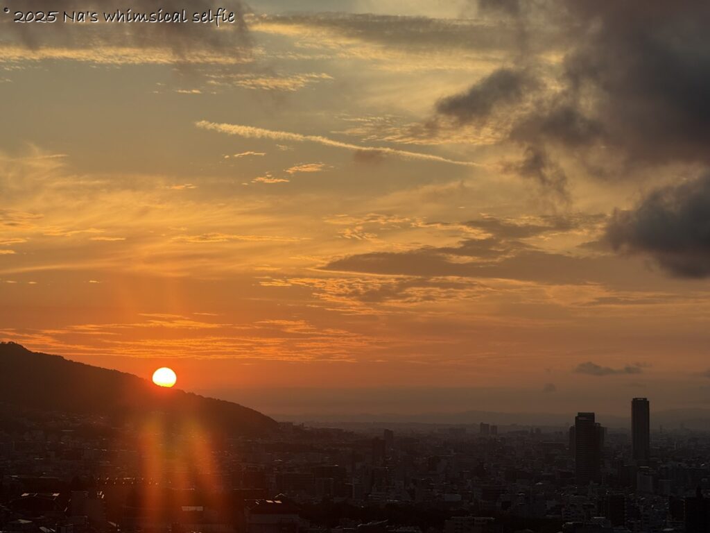 窓のカーテンを開けると絵にかいたような日の出のタイミングでした。